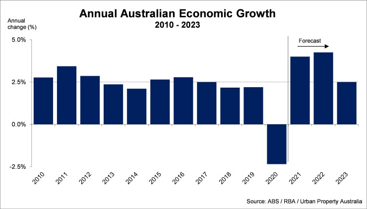 Australia’s economy is forecast to grow by 4.0% over 2021 (slightly lower than previous projections) and 4.25% over 2022. Beyond the near-term impact on activity from the lockdowns, the level of GDP is forecast to be a little higher in 2023 than was previously forecast.
