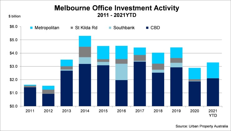- Sales activity in Melbourne’s metropolitan office market has surged in the second half of 2021 with more than $1 billion transacted in 2021 to date, almost doubling its long-term average;