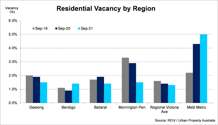 According to the REIV, as at September 2021, the vacancy rate for Regional Victoria remains very tight at 1.3% (down from 1.4% a year earlier). The vacancy rates of the major Regional Cities also remain very low, led by Bendigo and Ballarat (1.4%) with Geelong at 1.5%.